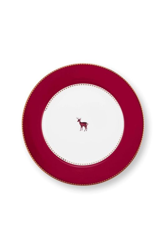 This porcelain plate from our Love Birds collection is a charming addition to your tableware. The deep dark red background exudes warmth and elegance, setting the stage for a refined medallion with two loving birds, surrounded by delicate flowers and golden accents that subtly catch the light. The plate is perfect for a cosy breakfast, a beautifully presented starter, or a special cake moment. The diameter is 21cm.